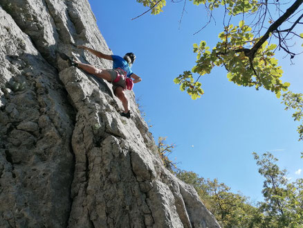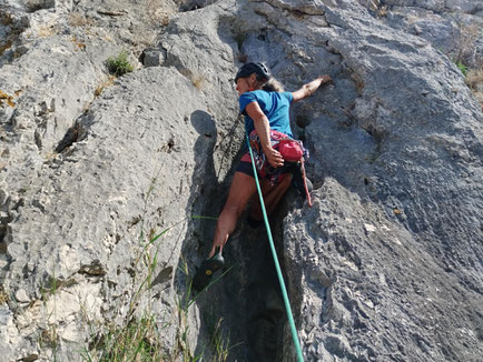 Après une session dans le rocher à trous de la Ligurie, ça fait un petit changement de style. Le rocher n'a pas les mêmes prises, il faut serrer, chercher les meilleurs réglettes, strates, bien se positionner sur les pieds, bref reprendre la base de données escalade propres à l'escalade d'ici.