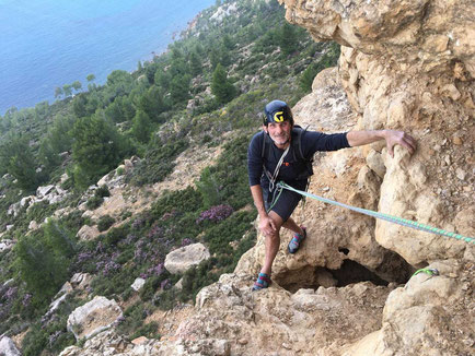 Avec mon oursin du jour, ce fût danse sur le rocher. Choix de voie modifié une fois arrivés au bas des voies. Qu'à cela ne tienne, ce fût même une chance de changer de voie car cela a permis à mon binôme de faire avec la difficulté et de voir que cela passait en technicité et de s'affirmer. Au final, Plein les yeux, plein les doigts, le croustillant rocher nous a ravis. et c'est toujours aussi bien de se retrouver face au large dans ce petit coin des Calanques un moment de pur bonheur.