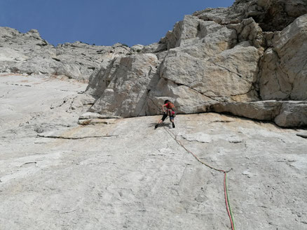 Hop hop, un peu de frais en montagne. Grimpe à 2000m d'altitude + vent, tout juste si par moments on n'a pas froid! Voie qui nécessite une concentration max, lecture difficile, rocher pas évident, et gaz! L1 3 pas bien morpho au milieu, L2 un pas délicat au 3/4 en trav. L3 être Gecko et se faire léger, les longueurs de fin déroulent sur de la dentelle entre points espacés. Conseil : mettre un pantalon pour protéger et y aller!Ca grimpe tout le long sans repos, grimpe soutenue